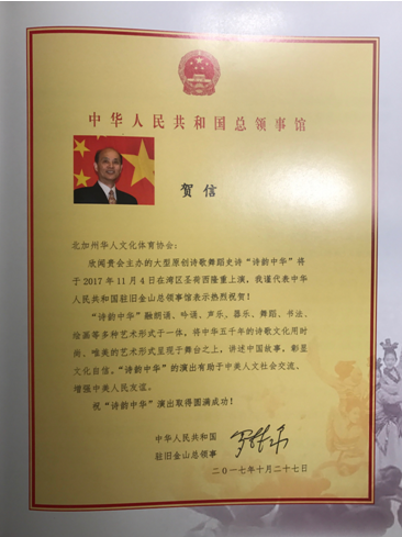 中国驻旧金山总领事罗林泉,当地议员张昭富与夫人,文化参赞肖夏勇与夫人等专程到会观演或发来了贺电。两千多嘉宾及观众们给予这场原创的诗韵中华演出以高度评价,台上台下诗情澎湃,掌声雷动,大家以热烈掌声与激动泪水来感激和回馈专程从国内来的表演艺术家代表团。