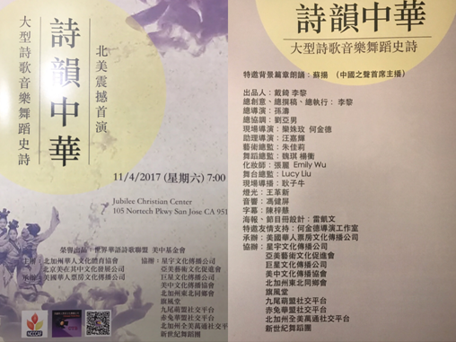[何金德导演工作室综合汛]"诗韵中华"大型原创诗歌音乐舞蹈史诗,于2017年11月4日晚在美国旧金山湾区硅谷朱碧丽中心盛大开场,完美落幕,赢得满堂喝彩。