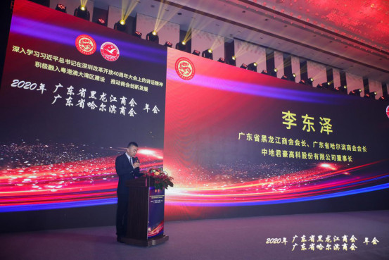 广东省黑龙江商会会长、广东省哈尔滨商会会长李东泽发表演讲表示,过去一年,广东省黑龙江商会以党建为引领,开展专题学习国家对民营企业的指示要求,有力提升了凝聚力、向心力。2020年,广东省黑龙江商会完善了各种制度规定,帮助组织家乡扶贫创业活动及参加兄弟商会活动数余场,成效明显;积极承担社会责任,为广东黑龙江商会树立了良好形象。并在讲话中特别感谢浪湃集团的大力支持和对社会的贡献,并达成了坚固的战略合作关系。