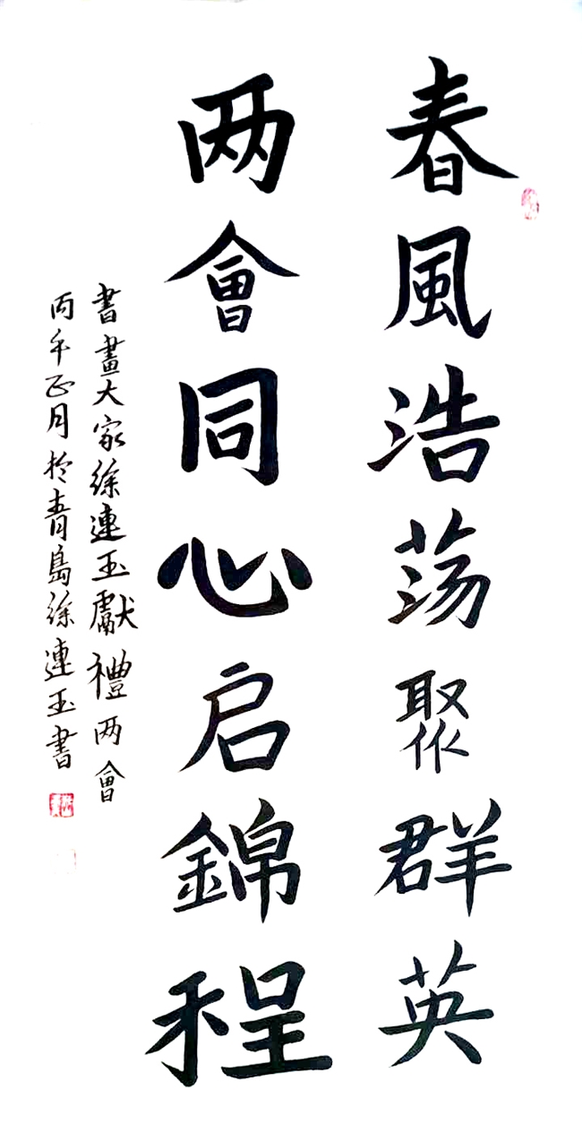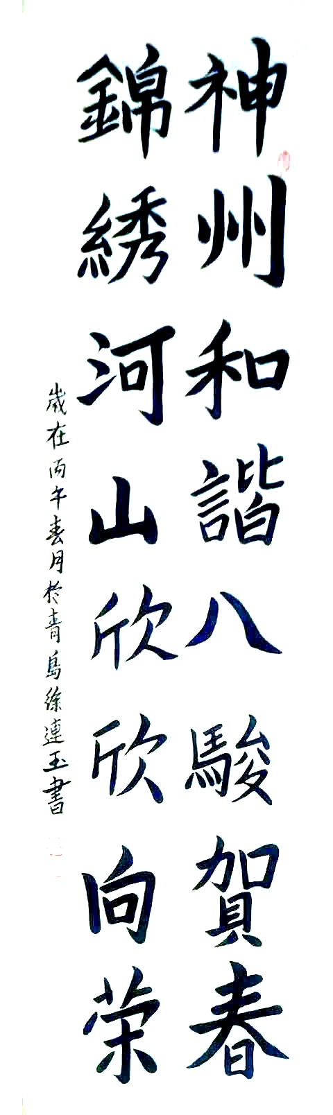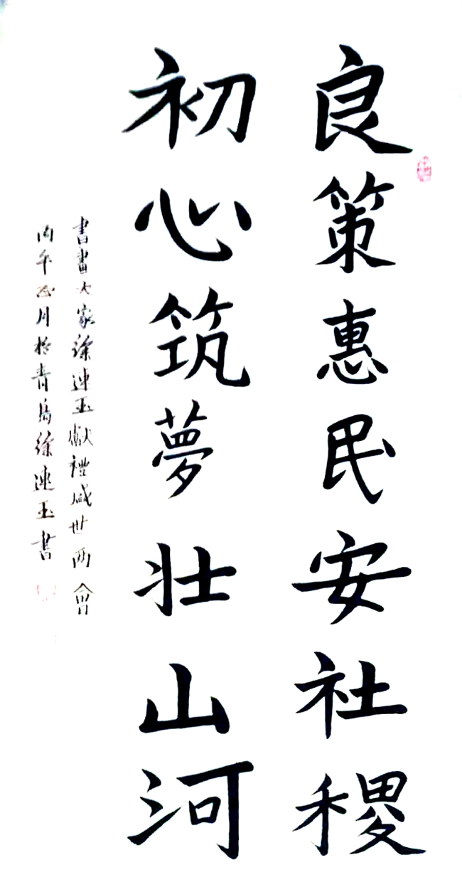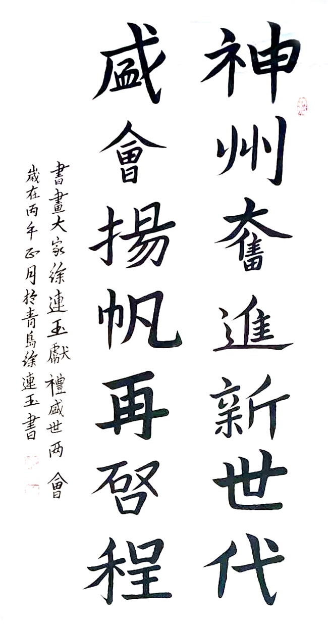 徐连玉的作品气势宏伟,笔墨技巧清新大雅,在书法之路上还将不断进取,继续学习,辛勤耕耘。为书法艺术的发杨和传承不知疲倦,继续努力前进。