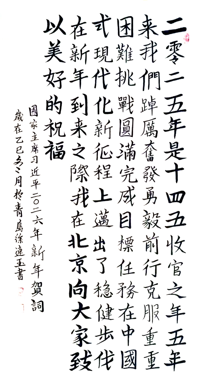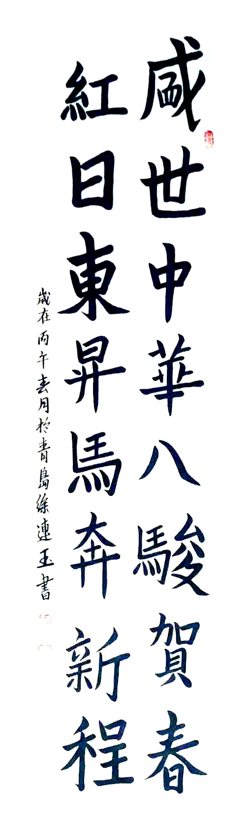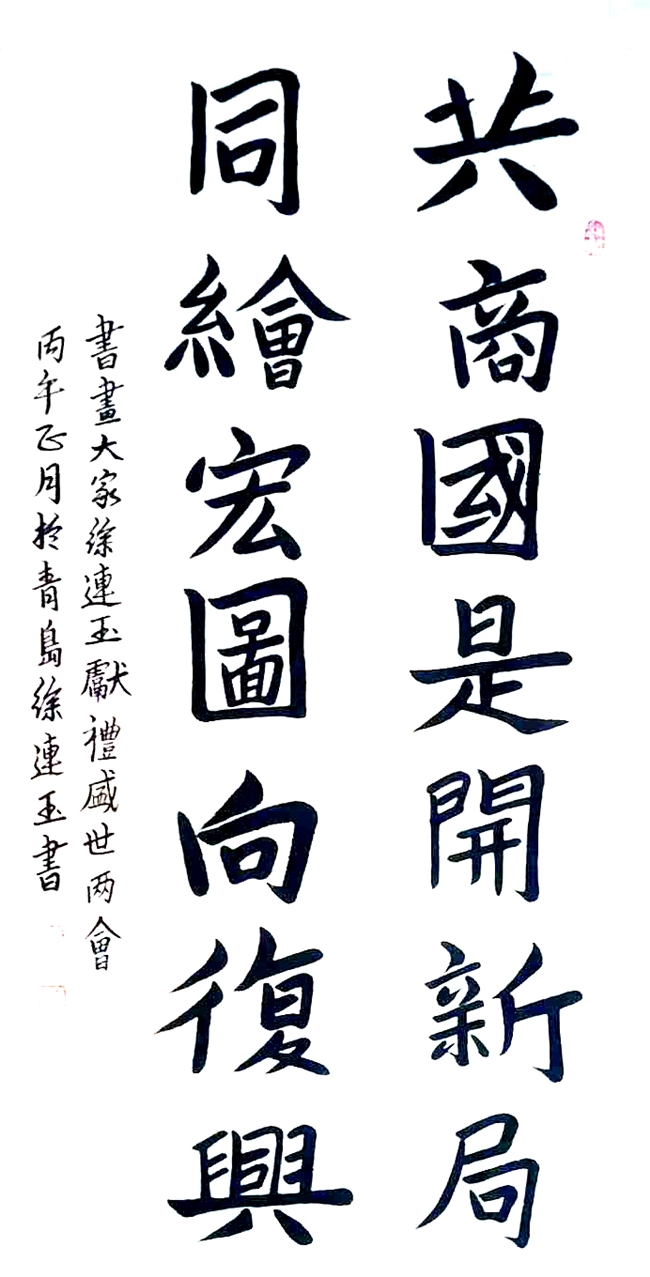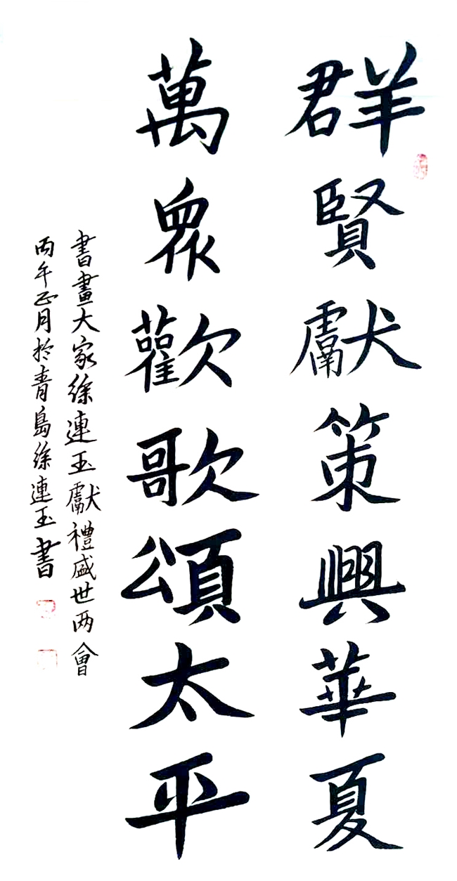徐连玉的作品气势宏伟,笔墨技巧清新大雅,在书法之路上还将不断进取,继续学习,辛勤耕耘。为书法艺术的发杨和传承不知疲倦,继续努力前进。