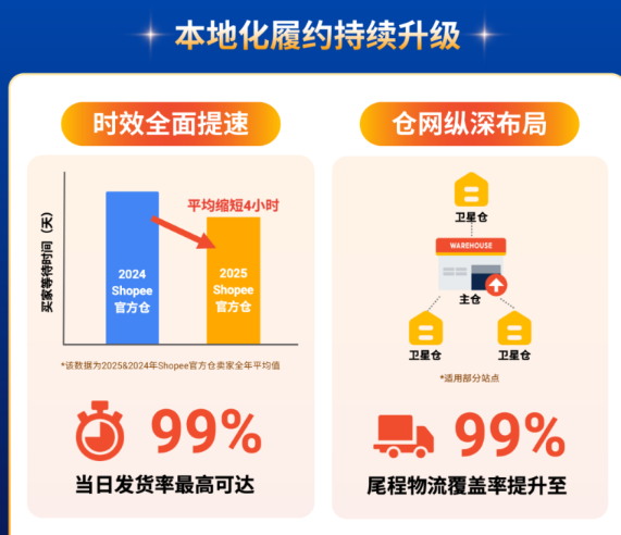 数据显示,2025年Shopee本地化履约单量同比增超100%,尾程物流覆盖率达99%,时效全面提速,成为平台增长支柱,契合2026年降本增效战略方向。